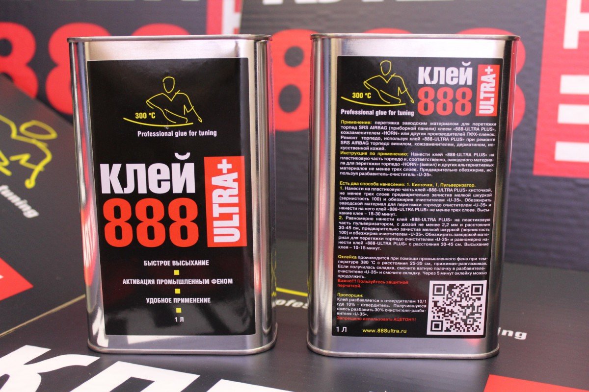 Клей 888 Ultra Plus - это совершенно уникальный по своим характеристикам продукт. Единственный его недостаток это то, что он клеит очень сильно. Отклеить приклеиваемый материал можно только с помощью компонента U35 и то, только если после контакта склеиваемых поверхностей не прошло много времени. Клей 888 Ultra Plus предназначен для оклейки любыми отделочными материалами пластика и совместим с любыми грунтовыми покрытиями, но, по мнению экспертов, он зарекомендовал себя как идеальный клей для поверхностей со сложным рельефом таких, как например « торпедо» в автомобилях или приборные панели в воздушных, морских и судах речного класса. Он подходит для абсолютно любых климатических условий: от сибирских морозов до экваториального зноя. Его температурный диапазон поистине фантастичен и полностью полимеризованный клей сохраняет прочность и пластичность от -70 до +300 градусов Цельсия.